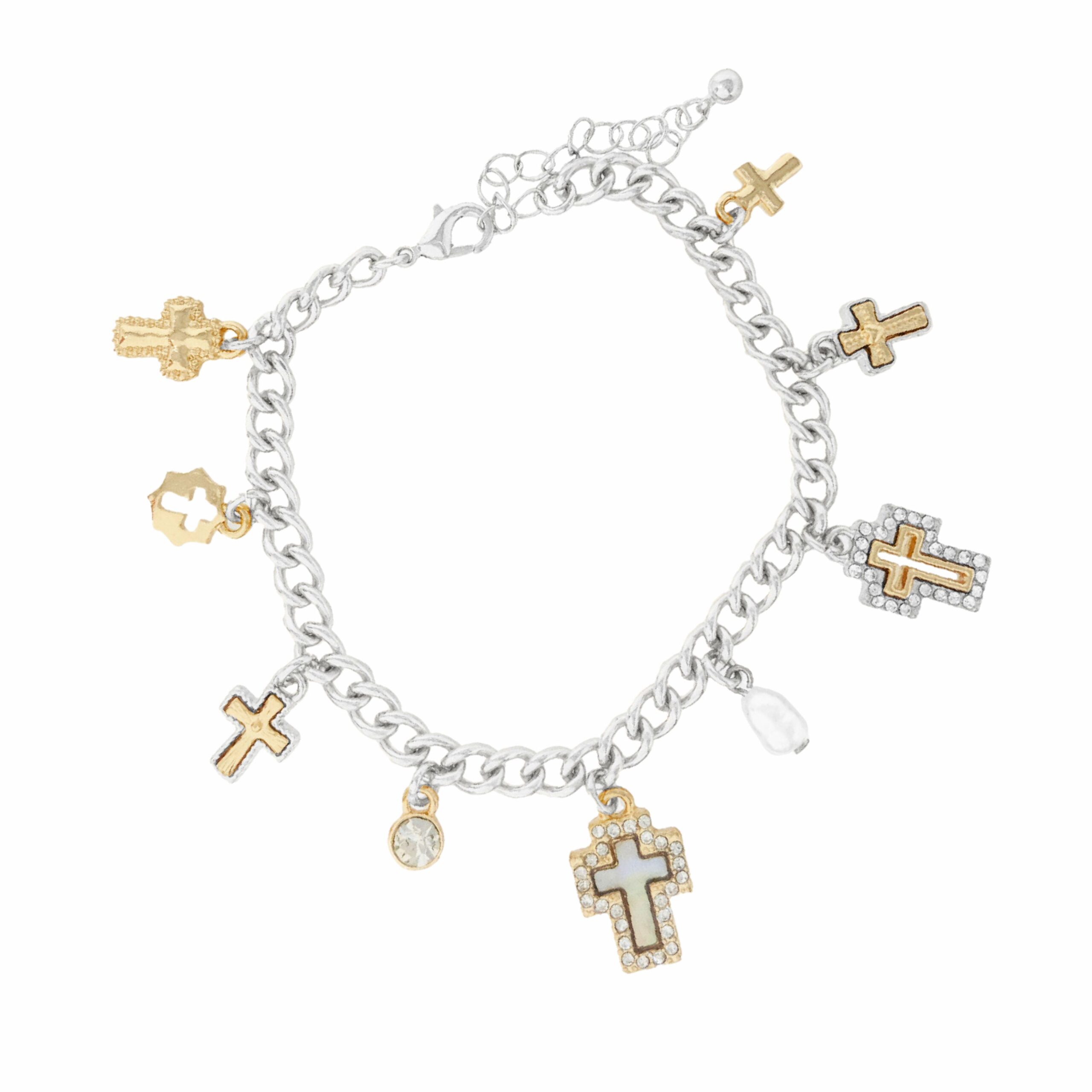 Two Tone Cross And Crystal Charm Bracelet