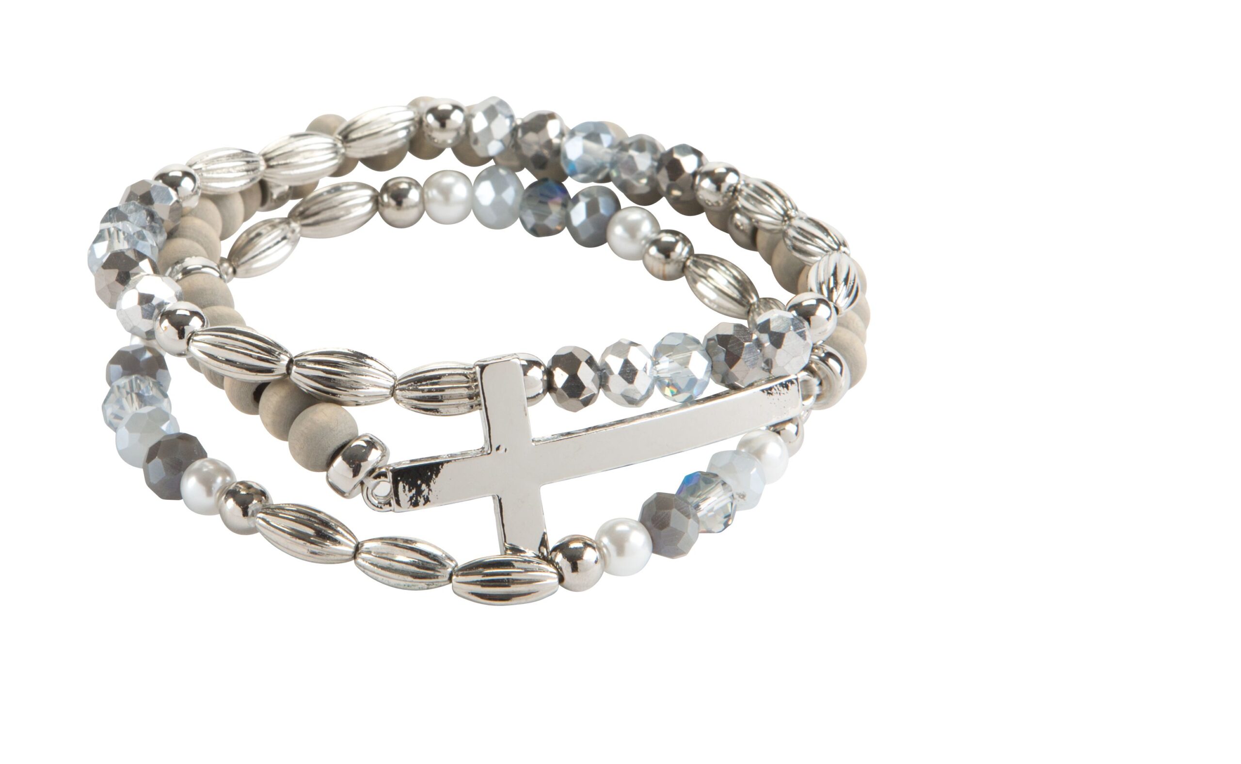 3 row wood and crystal bead cross stretch bracelet, 4 assorted