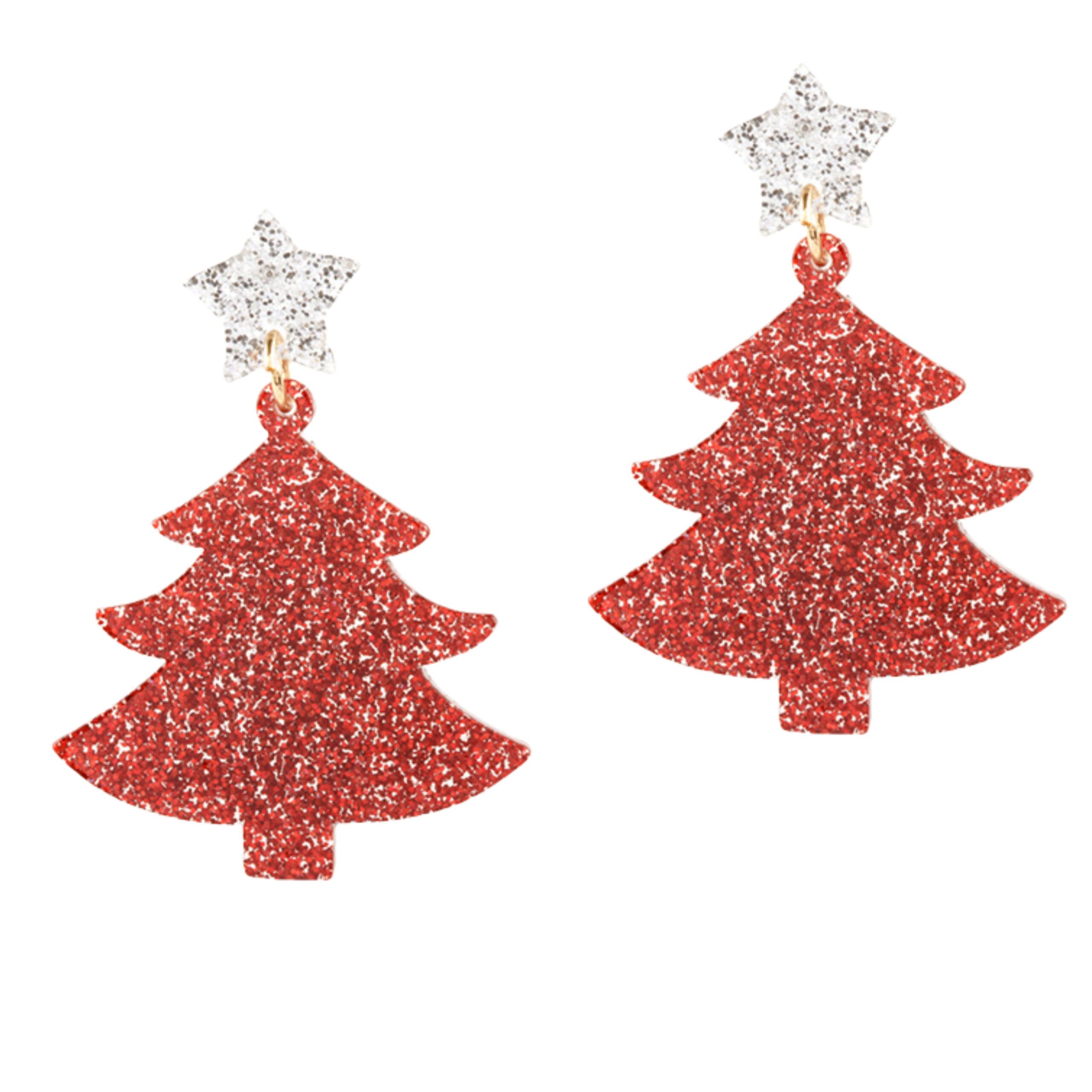 Red Glittery Christmas Tree Earrings