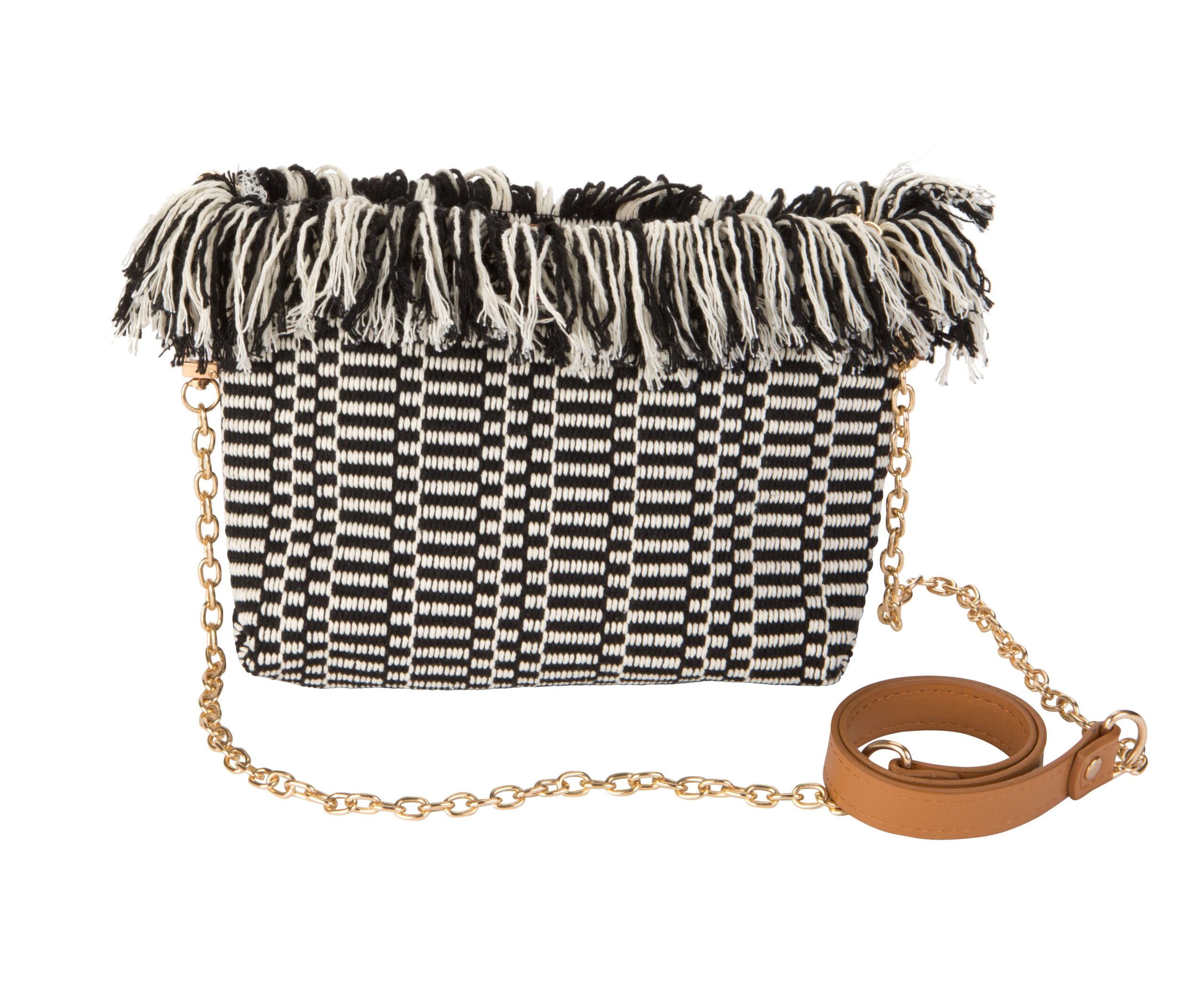 Crossbody Patterned Woven With Fringe Detail Bag, Zipper Closure, Chain Strap, 2 Assorted, 9.5″ W X 6″ H, 47″ Strap