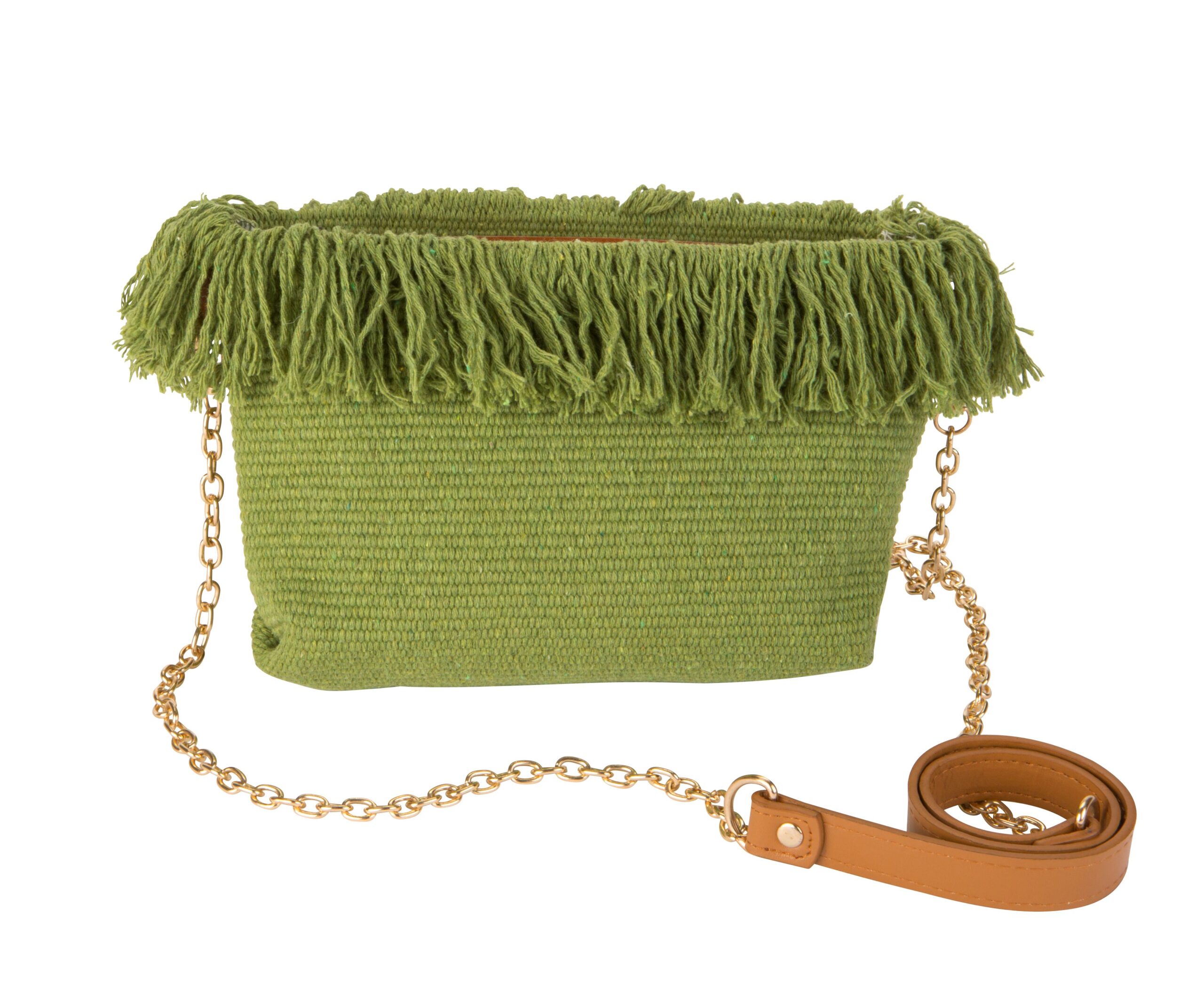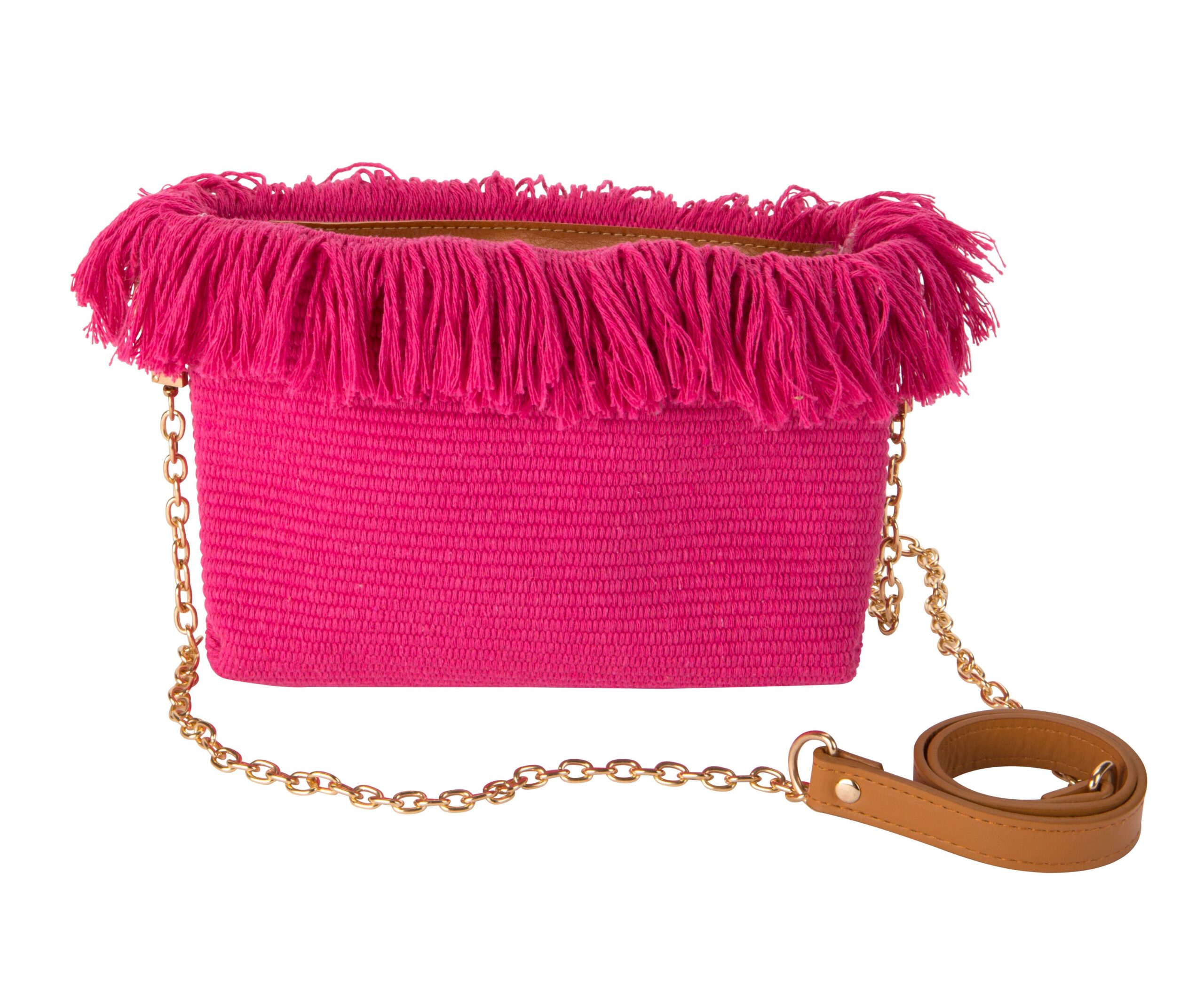 Crossbody Solid Colored Woven With Fringe Detail Bag, Zipper Closure, Chain Strap, 3 Assorted, 9.5″ W X 6″ H, 47″ Strap
