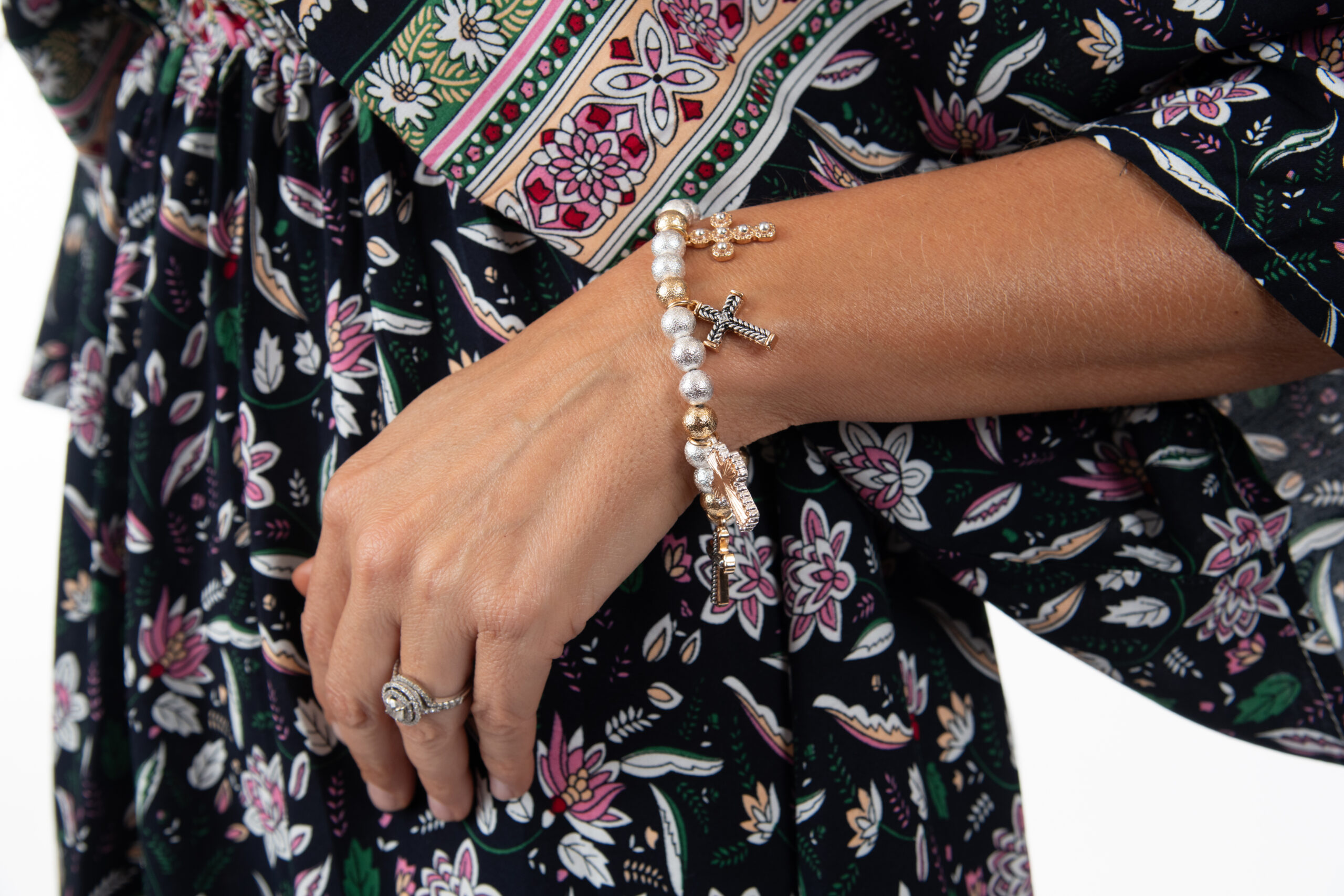 Two Tone Beads And Cross Charm Stretch Bracelet