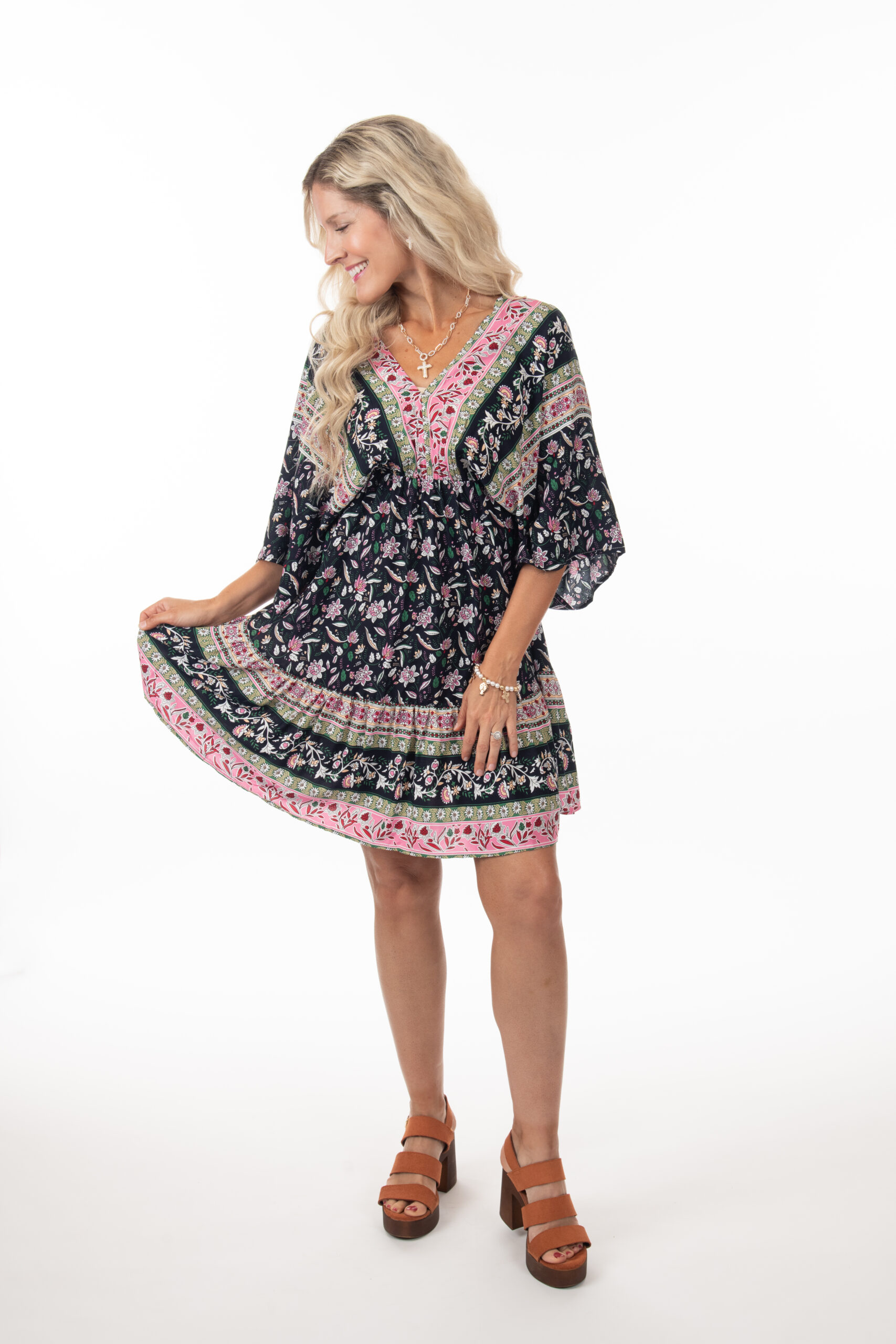 This dress enhances your waistline with the elastic waistband, while the classic V-neck design and half sleeves add a touch of sophistication. Perfect for any occasion, this timeless dress is a must-have